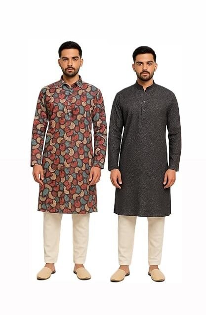 Men’s Cotton Kurta Set of 2 – 3D Printed Multicolor & Solid Black | Ethnic Long Kurta