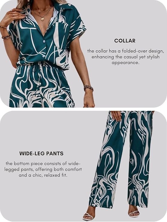 • This co-ord set for women’s western wear has a half sleeve with a front pocket, wide-leg trousers, and a turquoise colour with trendy aesthetics and comfort.