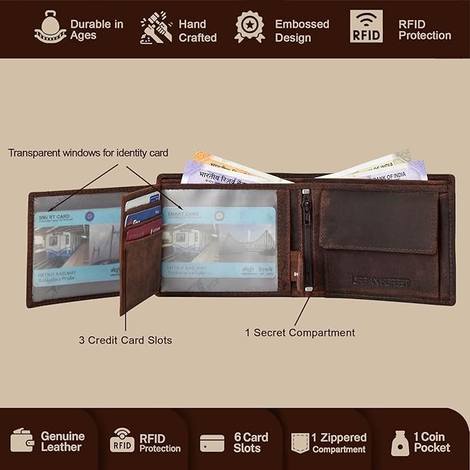 - INGENIOUS DESIGN – Keep all your essentials neat and organized in this stylish wallet. It’s typically a bi-fold wallet with a button closure inside which opens to reveal an extra flap. It has 6 in-build card slots, 2 currency slots, 1 secret compartment, a coin pocket and 3 transparent windows for your Driver’s License or work ID. The most distinctive feature of this wallet is an inside zippered compartment which gives you ample space to keep important bills or notes.