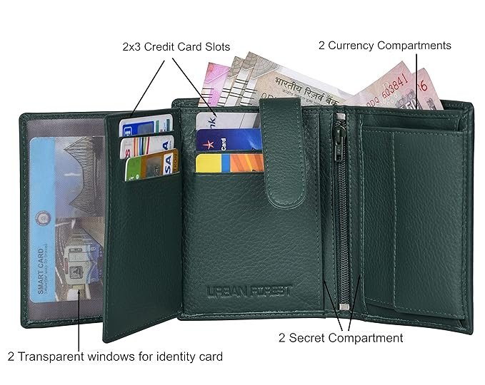 - INGENIOUS DESIGN – Keep all your essentials neat and organised in this exclusive vertical wallet. It’s typically a bi-fold wallet with a button closure inside which opens to reveal an extra flap. It has 9 in-built card slots, 2 currency slots, 2 secret compartments, 2 transparent ID windows and coin pocket. The most distinctive feature of this wallet is an inside zippered compartment perfect to keep your bills and receipts.
