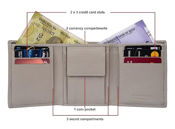 - GENIOUS DESIGN – Keep all your essentials neat and organised in this exclusive vertical wallet. It’s typically a bi-fold wallet with a button closure inside which opens to reveal an extra flap. It has 2 x 3 card slots , 2 currency slots , 1 Coin pocket and 3 secret compartments .